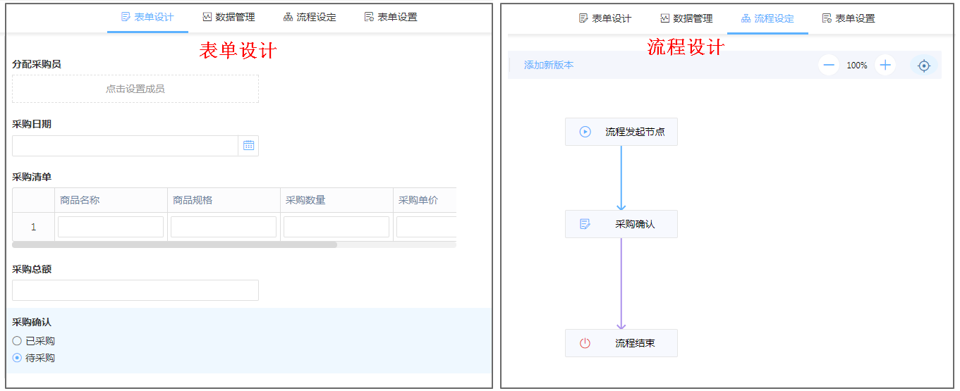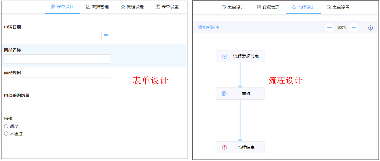 首先我们需要创建一个采购申请单,此申请单是流程表单,由员工录入申请需求,领导审核,申请单如下: