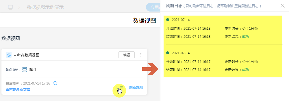 - 设置数据视图的刷新规则,设置规则后会定时在天/周/月/年的某天某个时间刷新数据,报表和表单调用时会调用最近一次的视图刷新的数据。一般用于大数据量时,周期性汇总分析时使用。