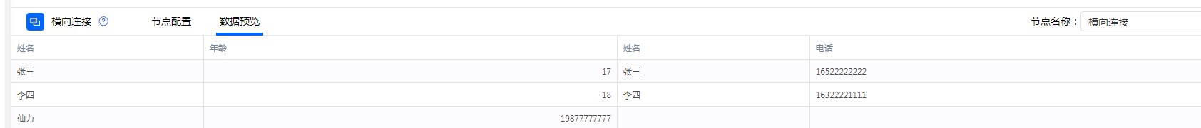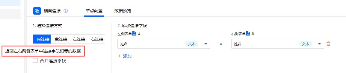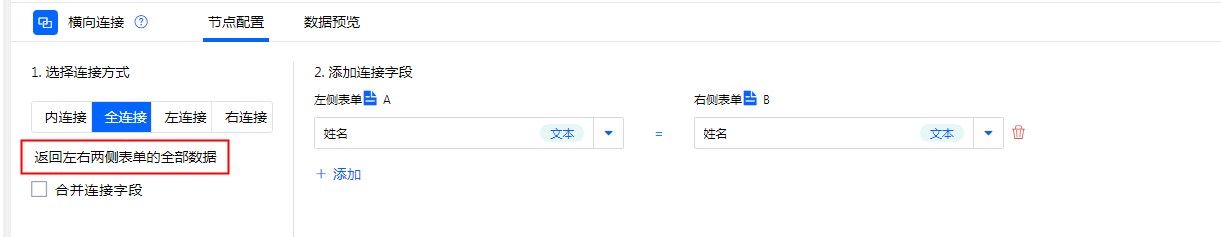 全连接:根据“连接字段”为条件匹配“表单A”与“表单B”,将两边表单数据全部展示。