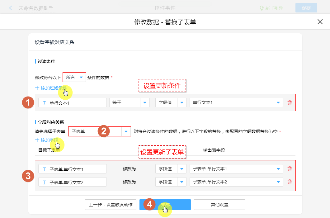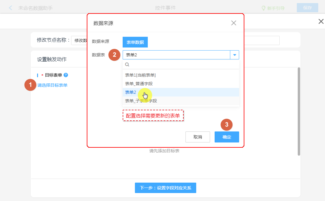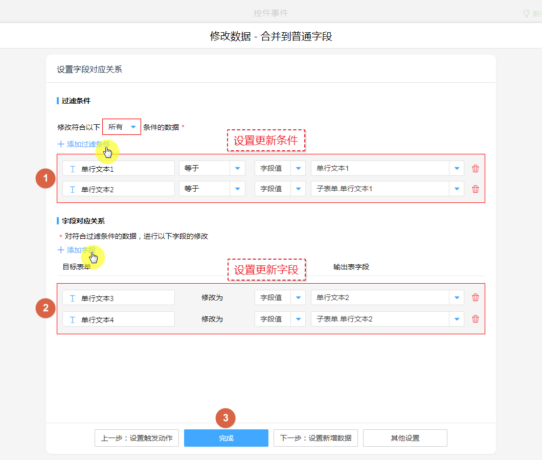 创建“修改数据”动作节点,将“输出表”的数据更新至其他表单。